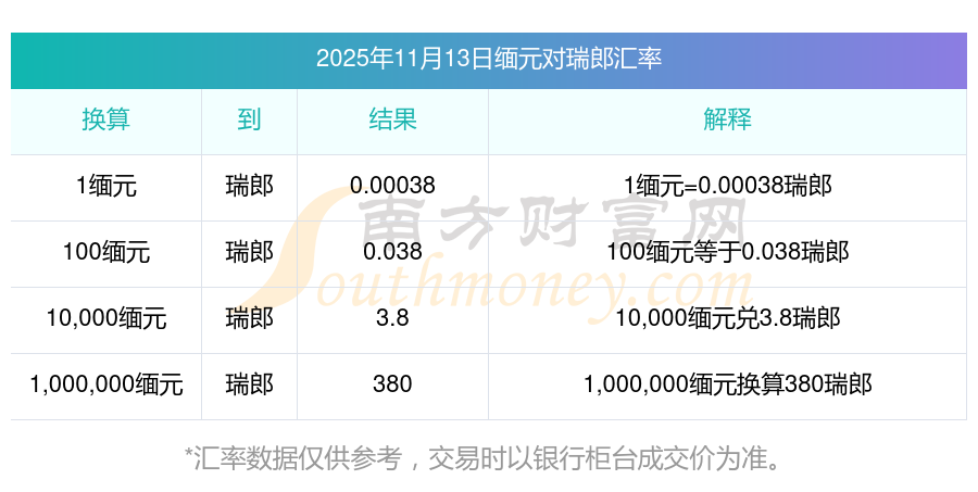 南方財富網(wǎng)為您提供緬元對瑞郎匯率最新價格詳情。