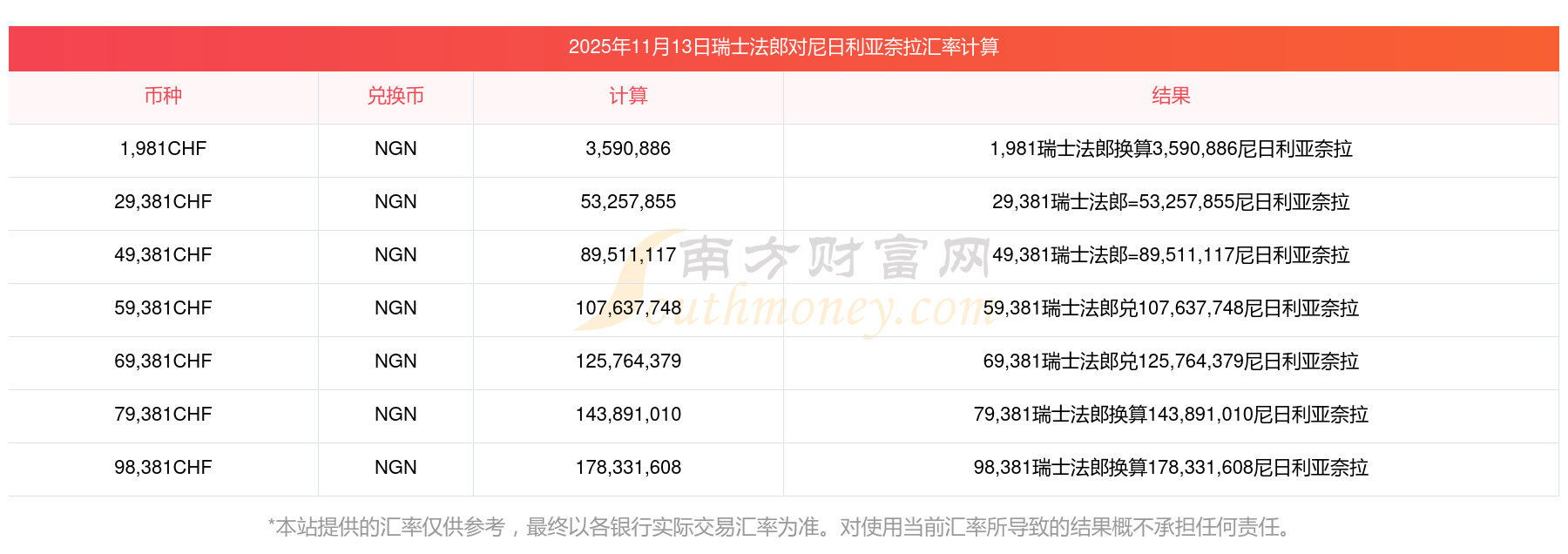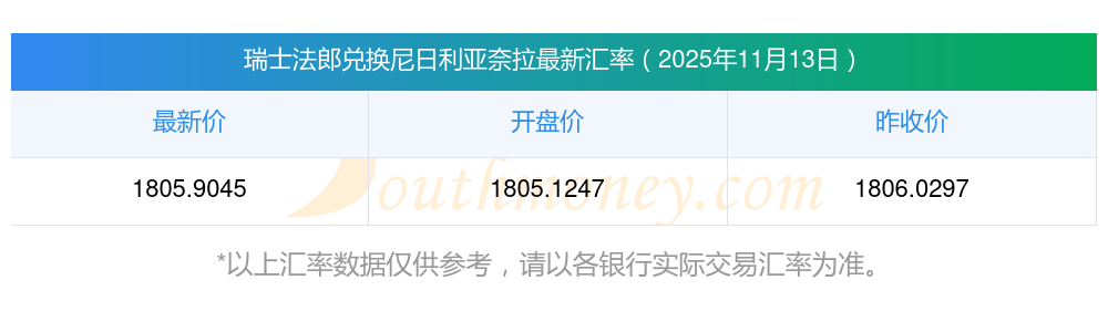今天瑞士法郎匯率買入價(jià) 120瑞士法郎兌尼日利亞奈拉匯率是多少?(2025-11-13)