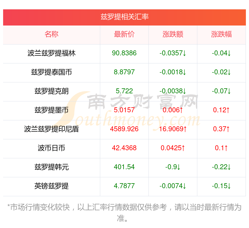 根據(jù)2025年11月13日匯率,茲羅提兌換克朗匯率最新價(jià)5.722000,今開價(jià)5.7258,昨收價(jià)5.7258,最高價(jià)5.7305,最低價(jià)5.7165。