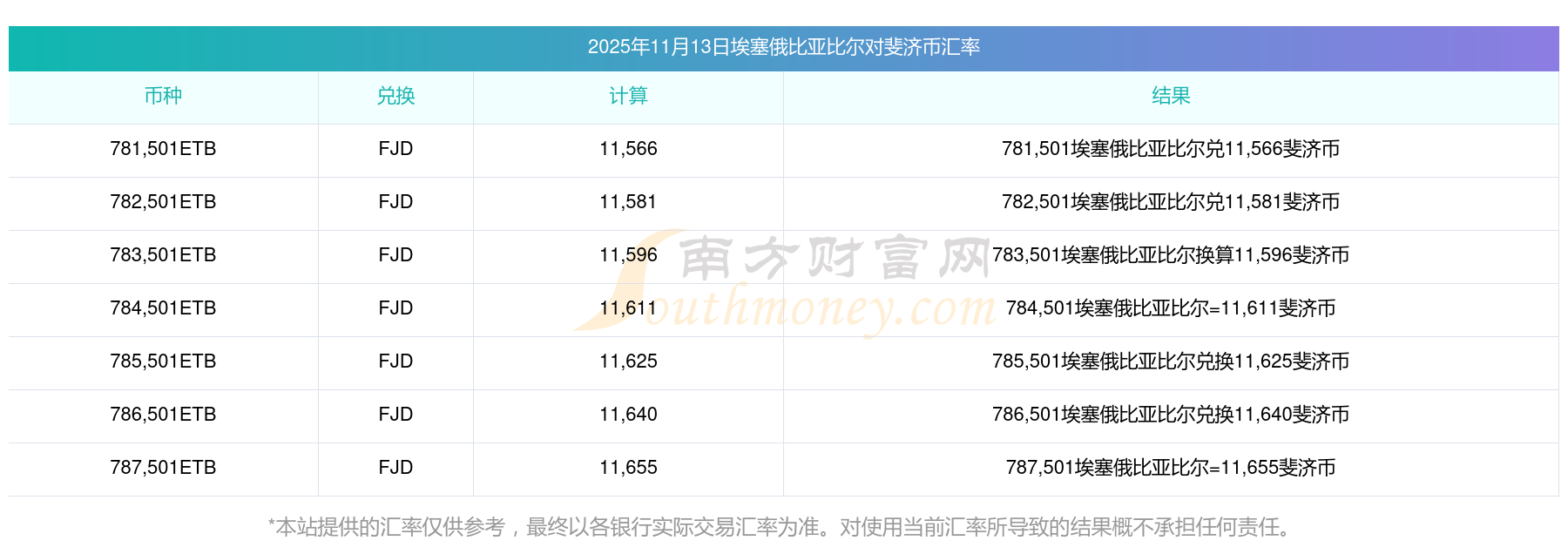 埃塞俄比亞比爾貨幣換算一覽表(2025年11月13日)
