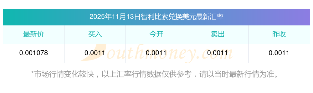 2025年11月13日智利比索對美元的匯率為:0.00108