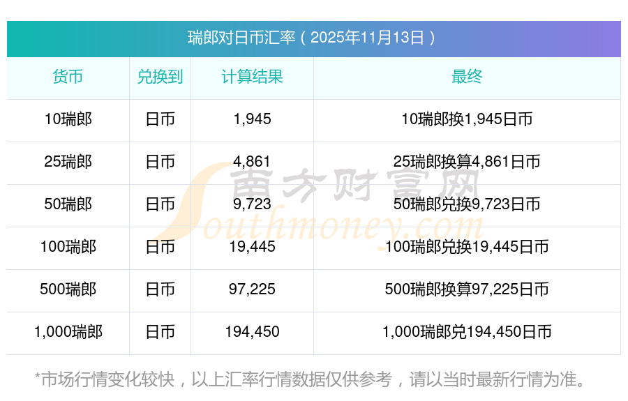 南方財(cái)富網(wǎng)為您提供瑞郎對(duì)日幣匯率最新價(jià)格詳情。