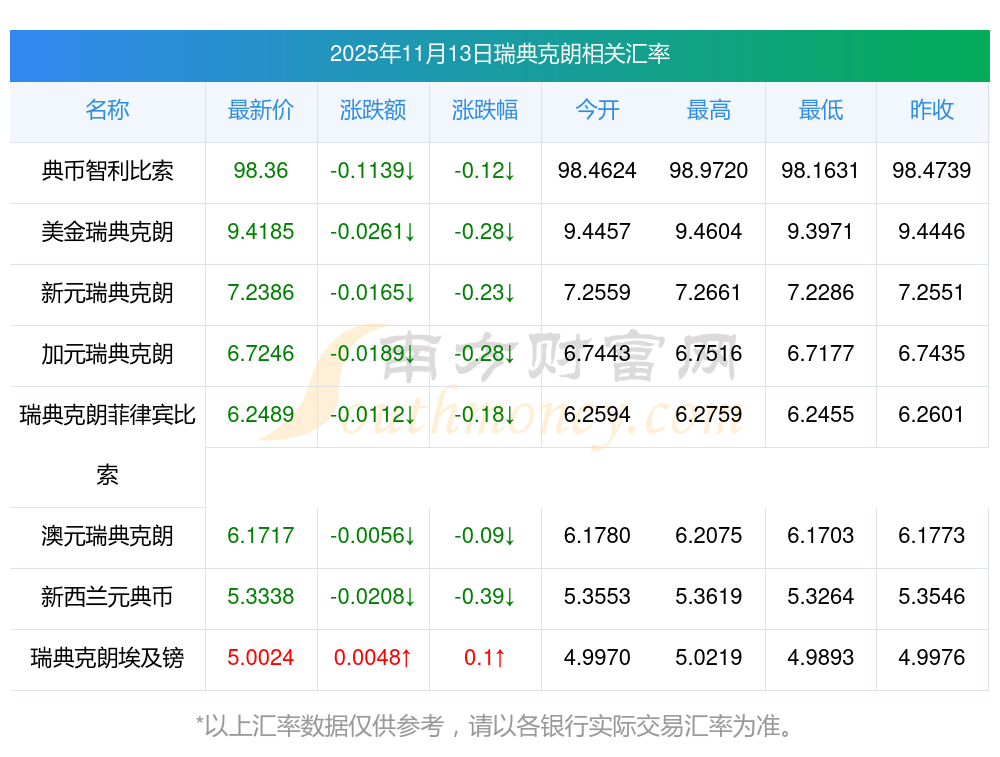 2025年11月13日瑞典克朗相關(guān)匯率查詢(xún)