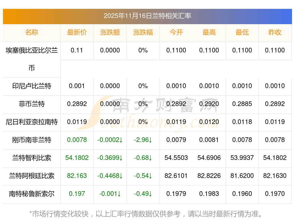 2025年11月16日最新消息,蘭特兌換智利比索最新匯率為54.180200,今開為54.5503,昨收為54.1802,最高為54.6906,最低為53.9937。