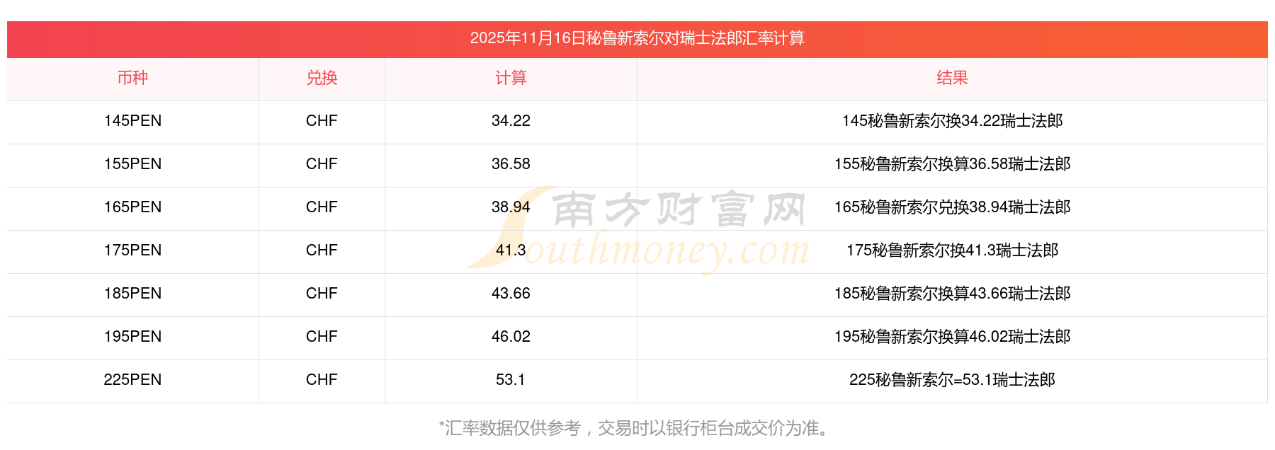 今天匯率更新!2025年11月16日66秘魯新索爾兌換瑞士法郎是多少?