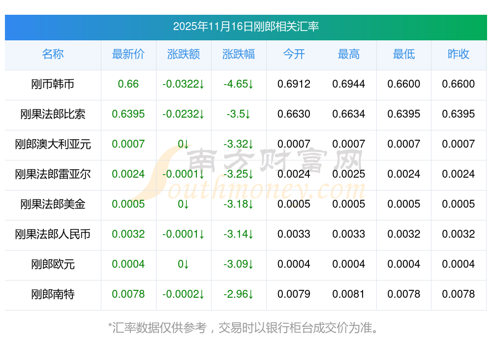 根據(jù)2025年11月16日匯率,剛郎兌換南特匯率最新價0.007783,今開價0.0079,昨收價0.0078,最高價0.0081,最低價0.0078。