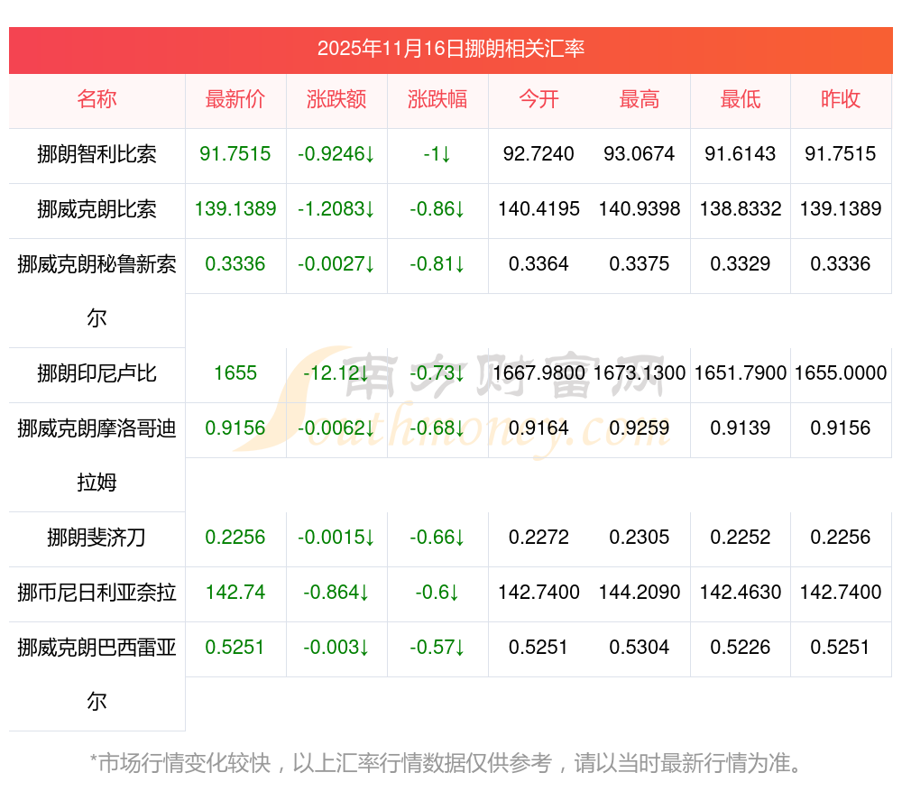 2025年11月16日最新消息,挪朗兌換比索最新匯率為1.816100,今開為1.8144,昨收為1.8161,最高為1.8329,最低為1.8118。