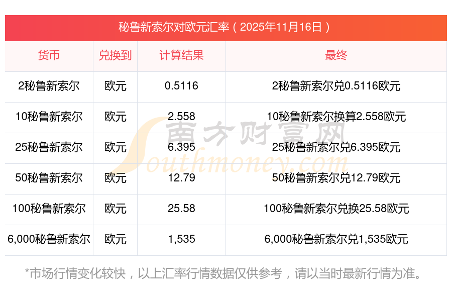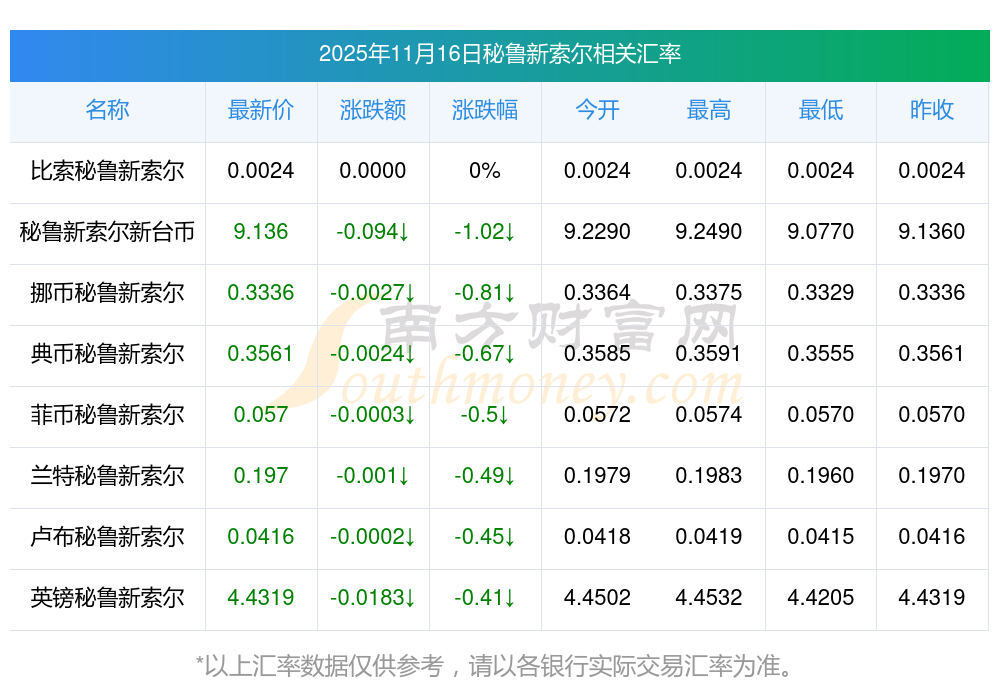 今天秘魯新索爾購匯行情:340秘魯新索爾對歐元匯率多少?2025-11-16