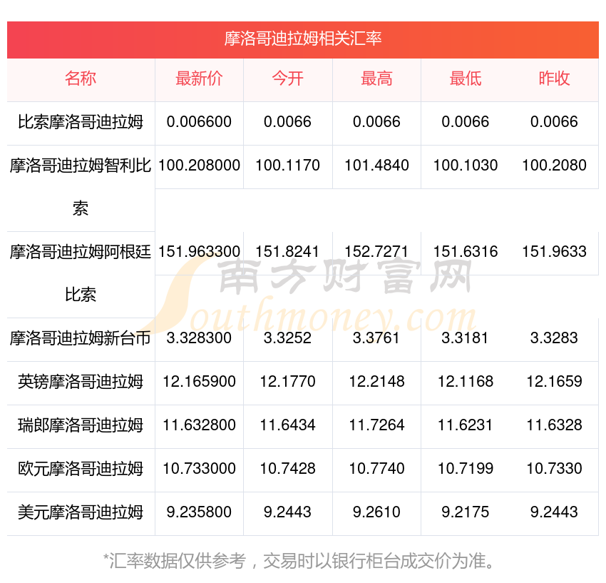 南方財(cái)富網(wǎng)為您提供摩洛哥迪拉姆對(duì)港幣匯率最新價(jià)格詳情。