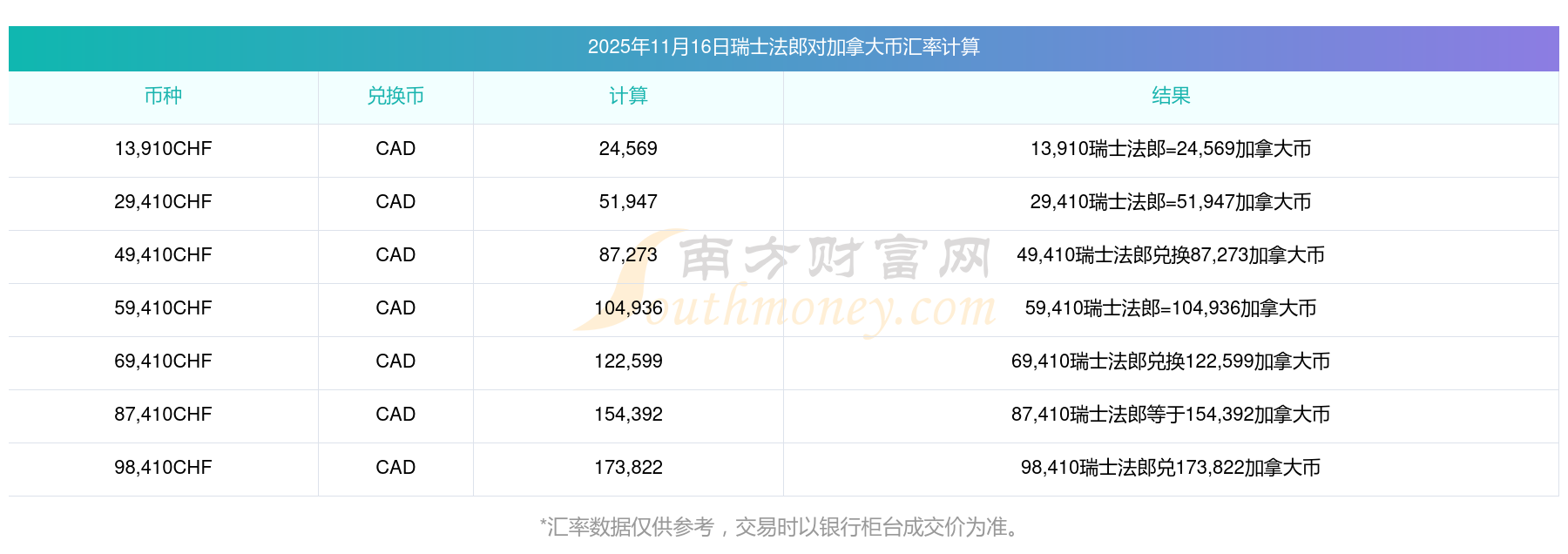 今天 瑞士法郎與加拿大幣外匯兌換是多少? 2025-11-16