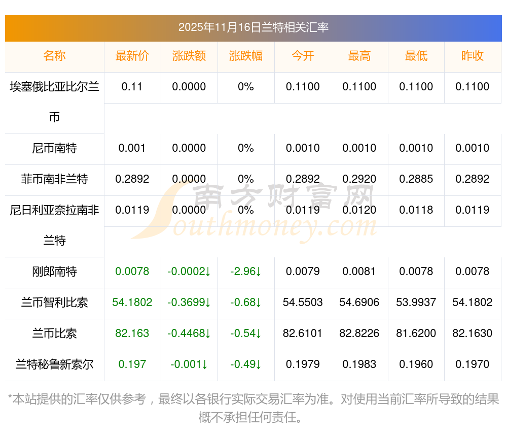 根據(jù)2025年11月16日匯率,蘭特兌換巴幣匯率最新價0.310100,今開價0.3101,昨收價0.3101,最高價0.3117,最低價0.3082。