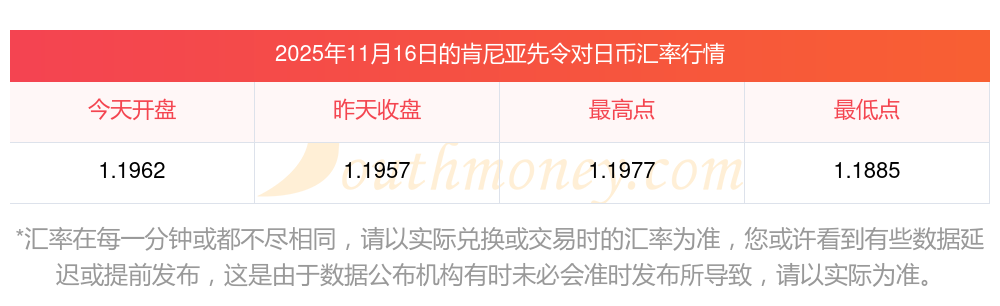 2025年11月16日的最新,貨幣兌換:10肯尼亞先令=1.19571日幣。舉例:假如一塊面包需要10肯尼亞先令,則需日幣:1.19571日幣。