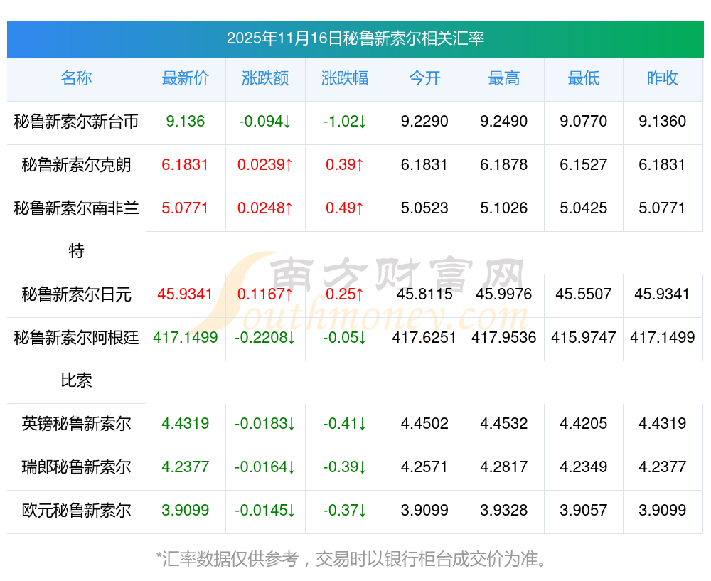 今日匯率調整最新消息 秘魯新索爾兌換林吉特匯率是多少2025年11月16日