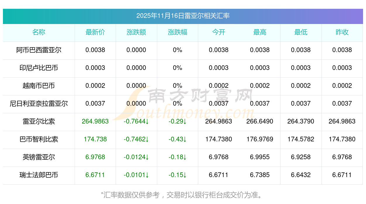 2025年11月16日雷亞爾相關(guān)匯率查詢