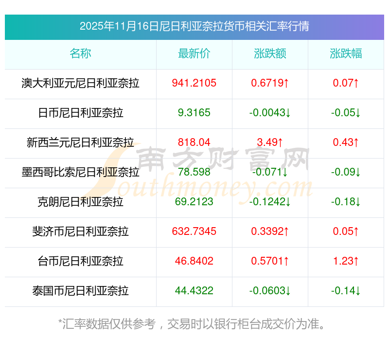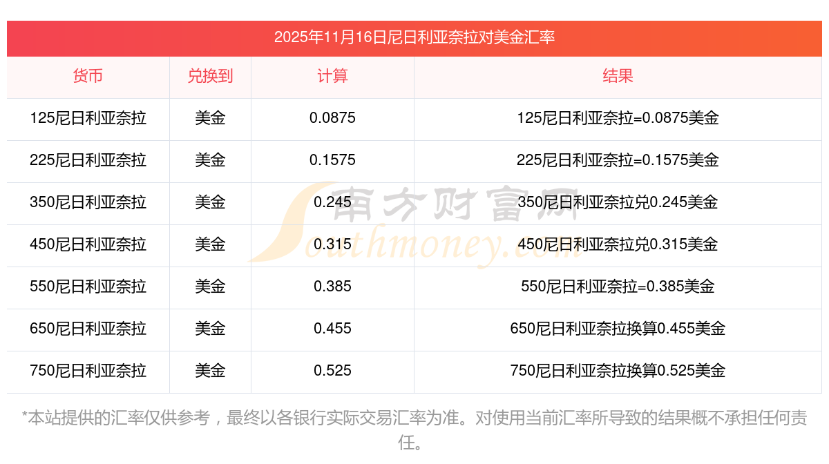 2025年11月16日尼日利亞奈拉換美金的匯率為:0.0007