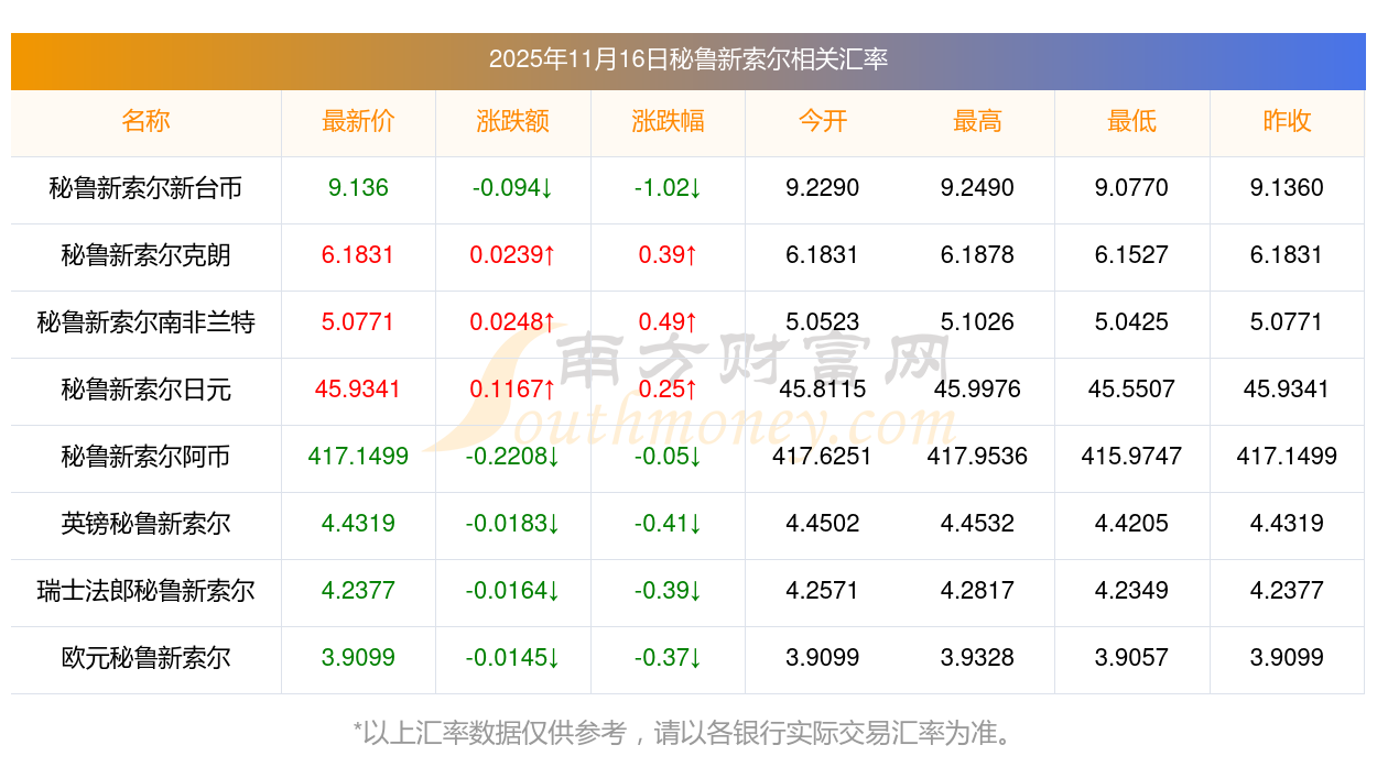 2025年11月16日秘魯新索爾相關(guān)匯率查詢