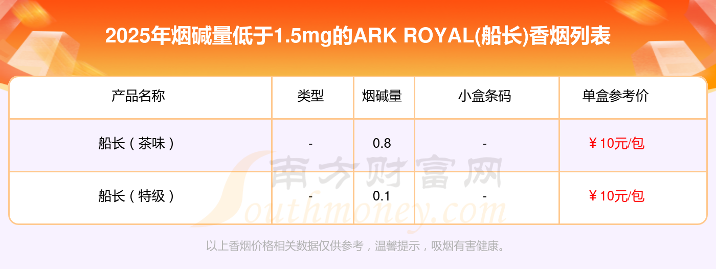 ARK ROYAL(船長(zhǎng))香煙煙堿量低于1.5mg的煙有船長(zhǎng)(茶味)、船長(zhǎng)(特級(jí))等,詳細(xì)價(jià)格如下: