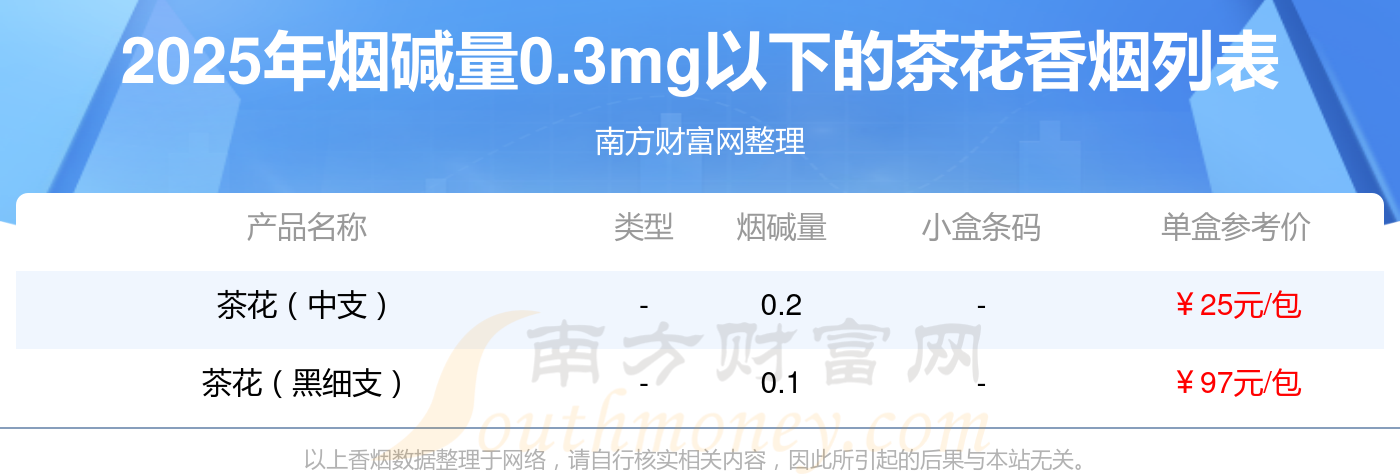 煙堿量0.3mg以下的茶花香煙有哪些?擇煙網(wǎng)為大家整理盤點,分別有:茶花(中支)、茶花(黑細支)等,具體價格如下:
