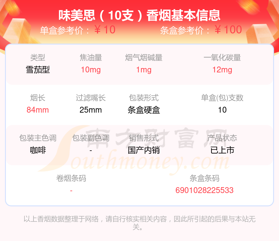 味美思香煙煙堿低于1mg的煙有味美思(5支)、味美思(10支)等,具體價(jià)格如下: