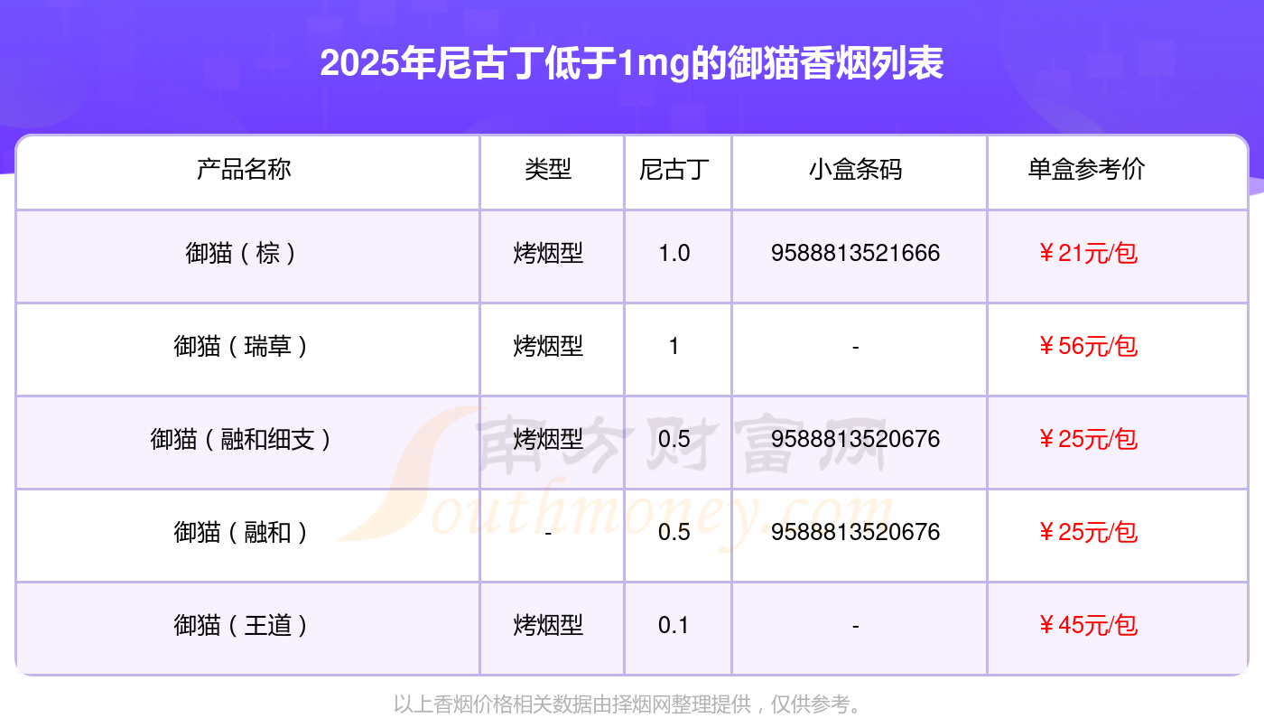 擇煙網(wǎng)為大家盤點(diǎn)了御貓香煙尼古丁低于1mg的,分別有御貓(棕)、御貓(瑞草)、御貓(融和細(xì)支)、御貓(融和)、御貓(王道)等,詳細(xì)價(jià)格如下: