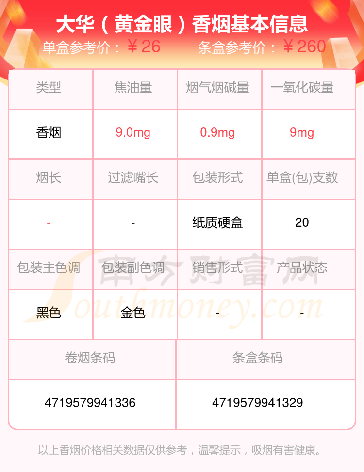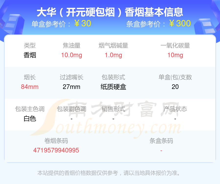 擇煙網(wǎng)為大家盤點(diǎn)了大華香煙煙堿1mg以下的,分別有大華(開元硬包煙)、大華(大時代)、大華(開元)、大華(大時代硬包煙)、大華(黃金眼)、大華(功夫)等,具體價格如下: