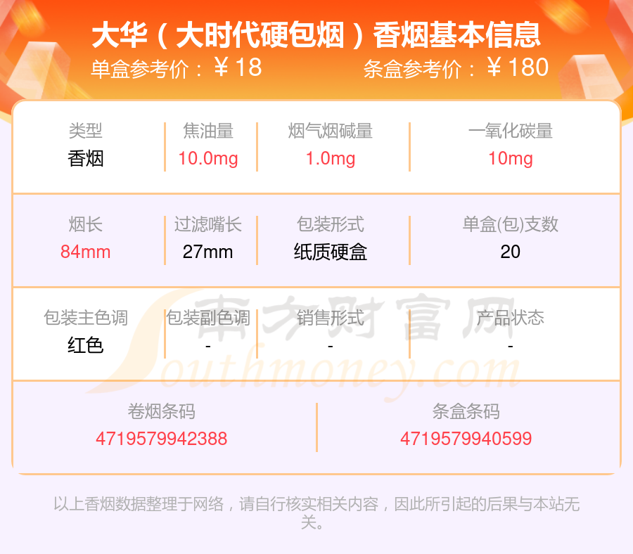 以上香煙數(shù)據(jù)整理于網(wǎng)絡(luò),請自行核實(shí)相關(guān)內(nèi)容,因此所引起的后果與本站無關(guān)。