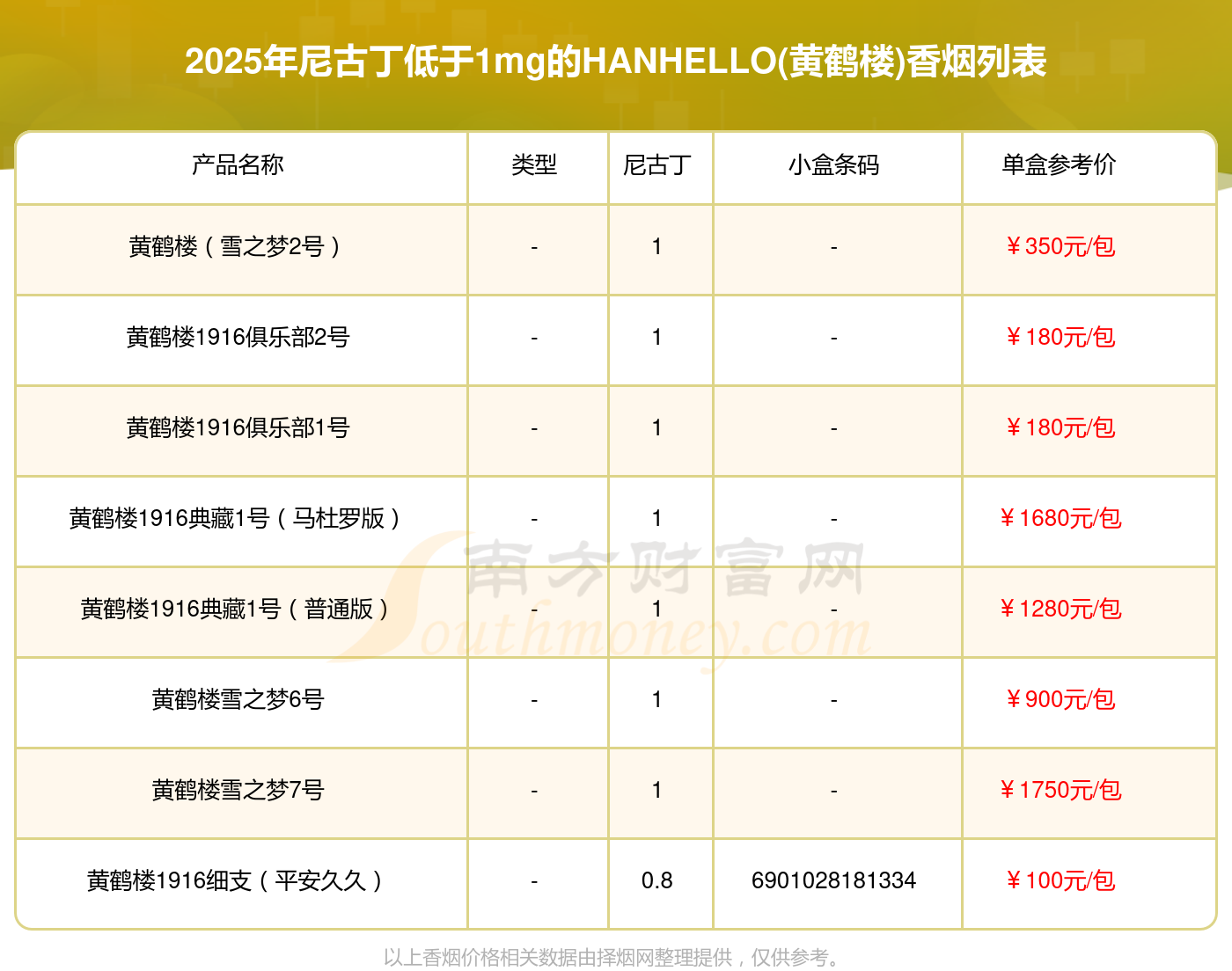 HANHELLO(黃鶴樓)香煙尼古丁低于1mg的煙分別有黃鶴樓(雪之夢2號)參考價(jià)350元/包、黃鶴樓1916俱樂部2號參考價(jià)180元/包、黃鶴樓1916俱樂部1號參考價(jià)180元/包、黃鶴樓1916典藏1號(馬杜羅版)參考價(jià)1680元/包、黃鶴樓1916典藏1號(普通版)參考價(jià)1280元/包、黃鶴樓雪之夢6號參考價(jià)900元/包、黃鶴樓雪之夢7號參考價(jià)1750元/包、黃鶴樓1916細(xì)支(平安久久)參考價(jià)100元/包等。