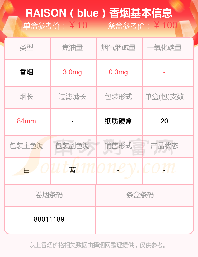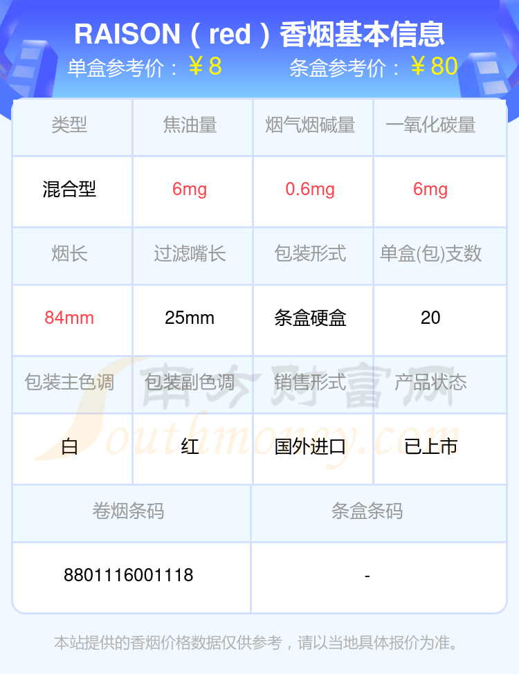 RAISON(red)參考價8元/包、RAISON(blue)參考價10.0元/包等。