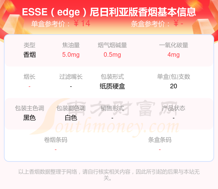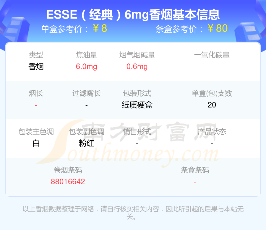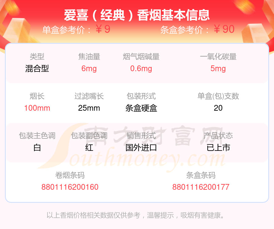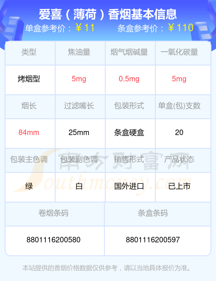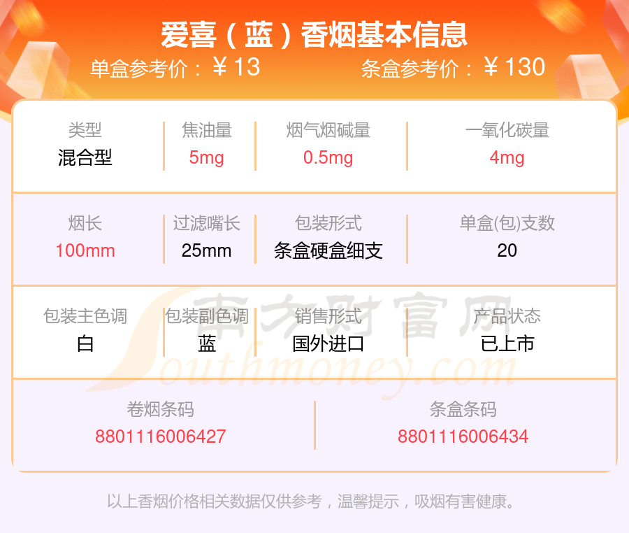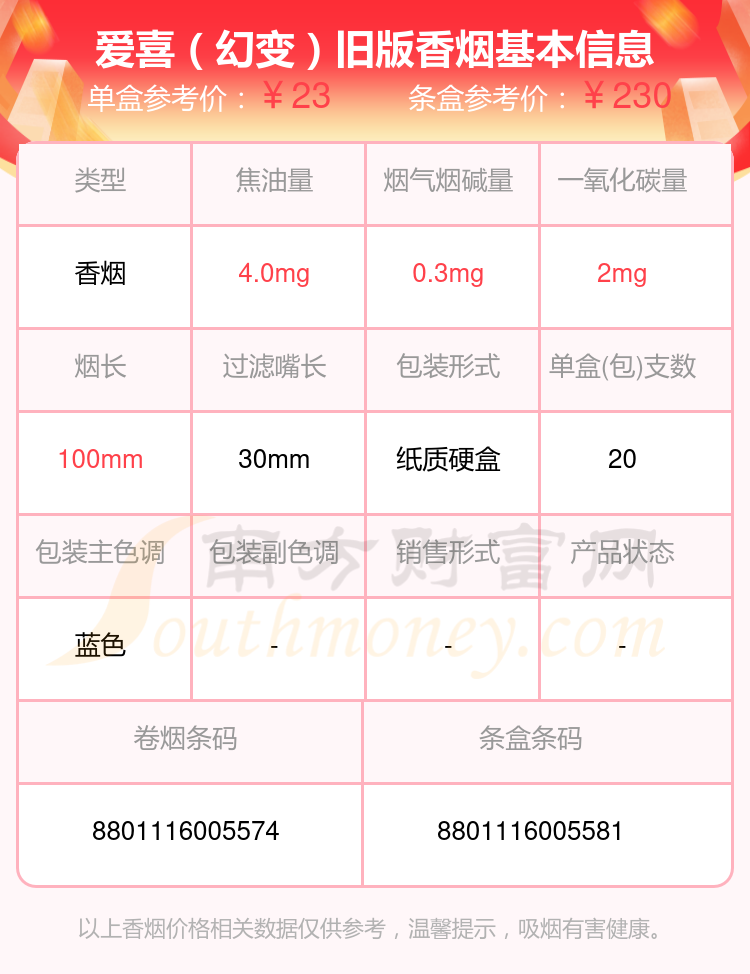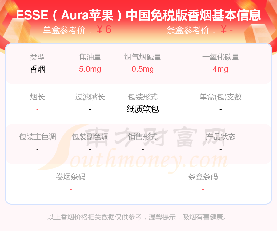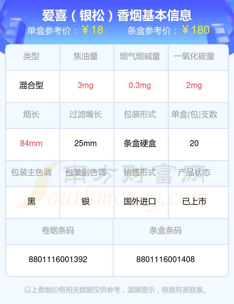擇煙網(wǎng)為大家盤點(diǎn)了ESSE(愛喜)香煙煙堿3mg以下的,分別有ESSE(經(jīng)典)6mg、愛喜(經(jīng)典)、ESSE(Aura蘋果)中國免稅版、愛喜(藍(lán))、ESSE(edge)尼日利亞版、ESSE(薄荷)5mg、愛喜(薄荷)、愛喜(藍(lán)特醇免稅韓版)、愛喜(銀松)、愛喜(幻變)舊版等,詳細(xì)價(jià)格如下: