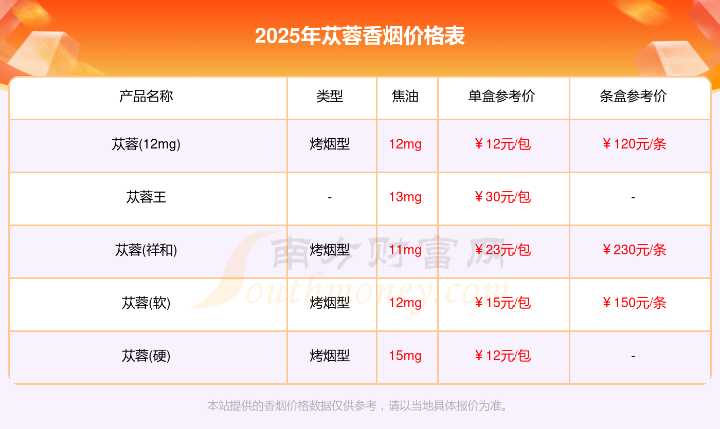 2025年,蓯蓉王、蓯蓉(祥和)、蓯蓉(軟)、蓯蓉(12mg)、蓯蓉(硬)等蓯蓉香煙價(jià)格如下:蓯蓉王參考價(jià)30.0元/包、蓯蓉(祥和)參考價(jià)23.0元/包、蓯蓉(軟)參考價(jià)15.0元/包、蓯蓉(12mg)參考價(jià)12.0元/包、蓯蓉(硬)參考價(jià)12.0元/包。