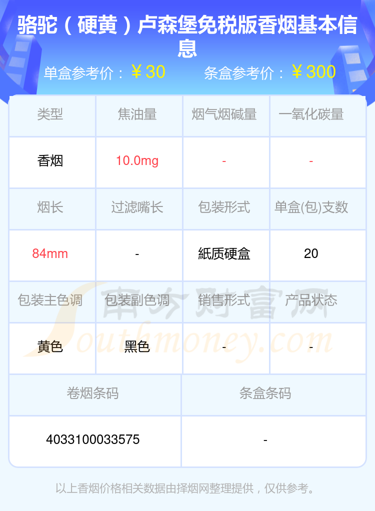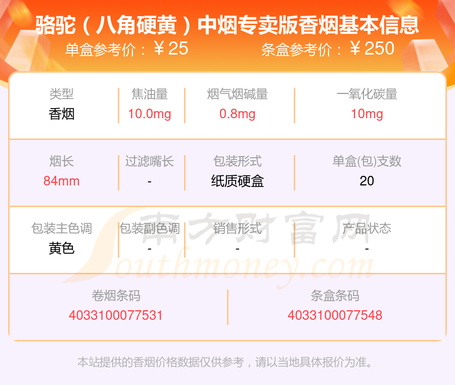 駱駝(硬黃)盧森堡免稅版參考價(jià)30.0元/包、駱駝(八角硬黃)中煙專賣版參考價(jià)25.0元/包等。