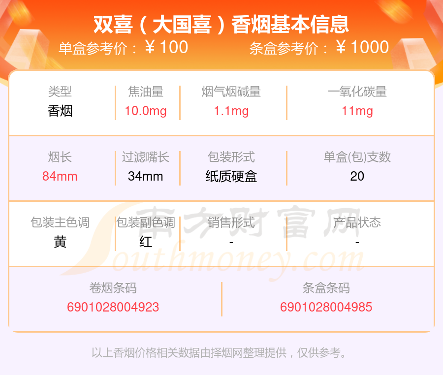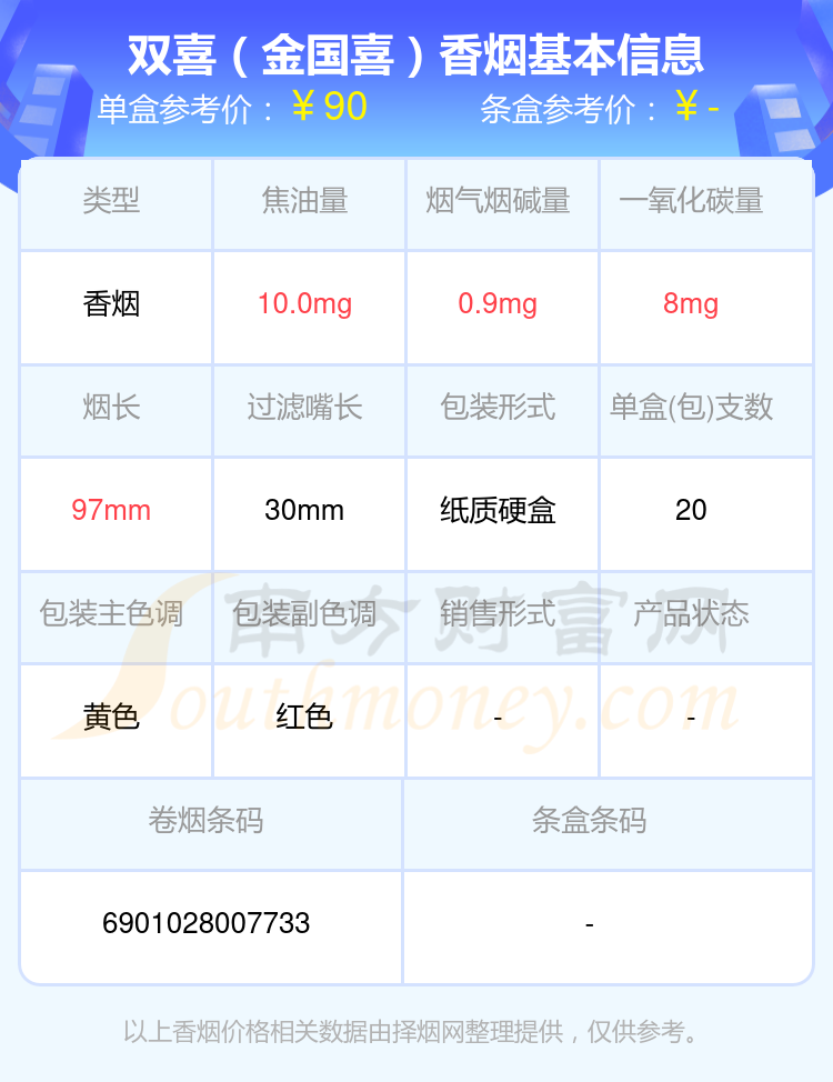 雙喜香煙超過九十元的煙有雙喜(金國(guó)喜)、雙喜(珍藏)、雙喜(硬盛世好日子)、雙喜(春天1979)、雙喜(沉香)、雙喜(細(xì)支盛世好日子)、雙喜(大國(guó)喜)、雙喜(典藏逸品)等,具體價(jià)格如下: