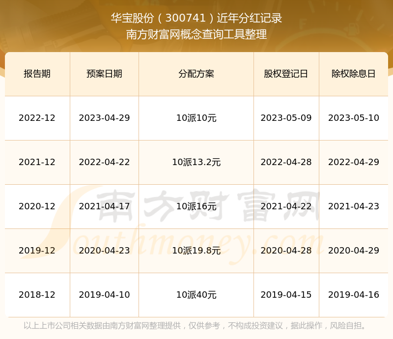一、華寶股份(300741)股票分紅記錄 華寶股份最新一次公布的分紅方案為10派10元。本次權(quán)益分派股權(quán)登記日為2023年5月9日,除權(quán)除息日為2023年5月10日,派息日為2023年5月10日。 近年華