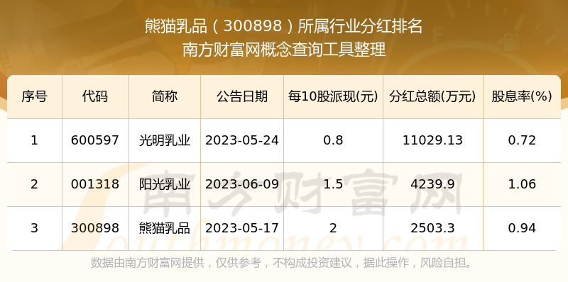 按照南方財富網(wǎng)趨勢選股系統(tǒng)統(tǒng)計,熊貓乳品所屬行業(yè)為乳制品行業(yè),乳制品行業(yè)分紅排名情況如下表: