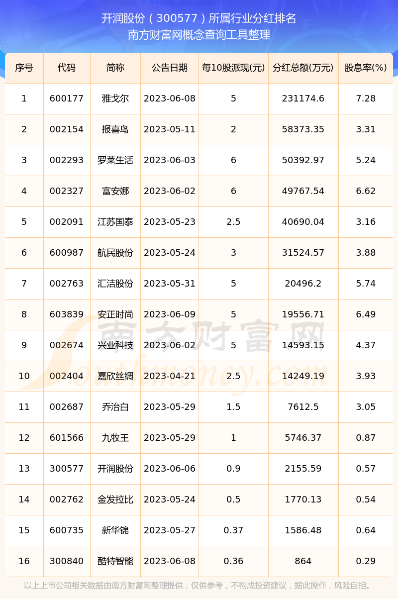 按照南方財富網(wǎng)趨勢選股系統(tǒng)統(tǒng)計,開潤股份所屬行業(yè)為紡織服裝行業(yè),紡織服裝行業(yè)分紅排名情況如下表: