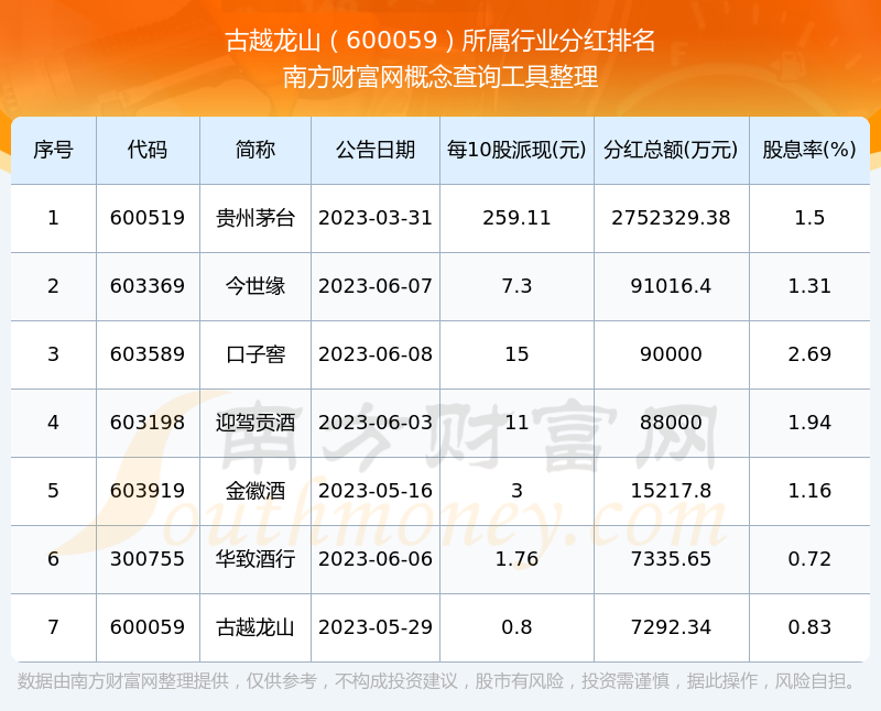 按照南方財(cái)富網(wǎng)趨勢選股系統(tǒng)統(tǒng)計(jì),古越龍山所屬行業(yè)為釀酒行業(yè)行業(yè),釀酒行業(yè)行業(yè)分紅排名情況如下表: