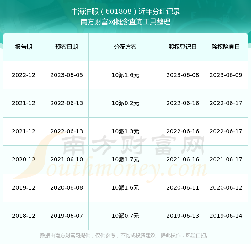 中海油服最新一次公布的分紅方案:10派1.6元。