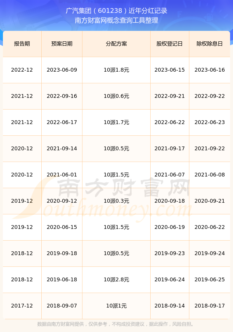 廣汽集團最新一次公布的分紅方案為10派1.8元。本次權益分派股權登記日為2023年6月15日,除權除息日為2023年6月16日,派息日為2023年6月16日。