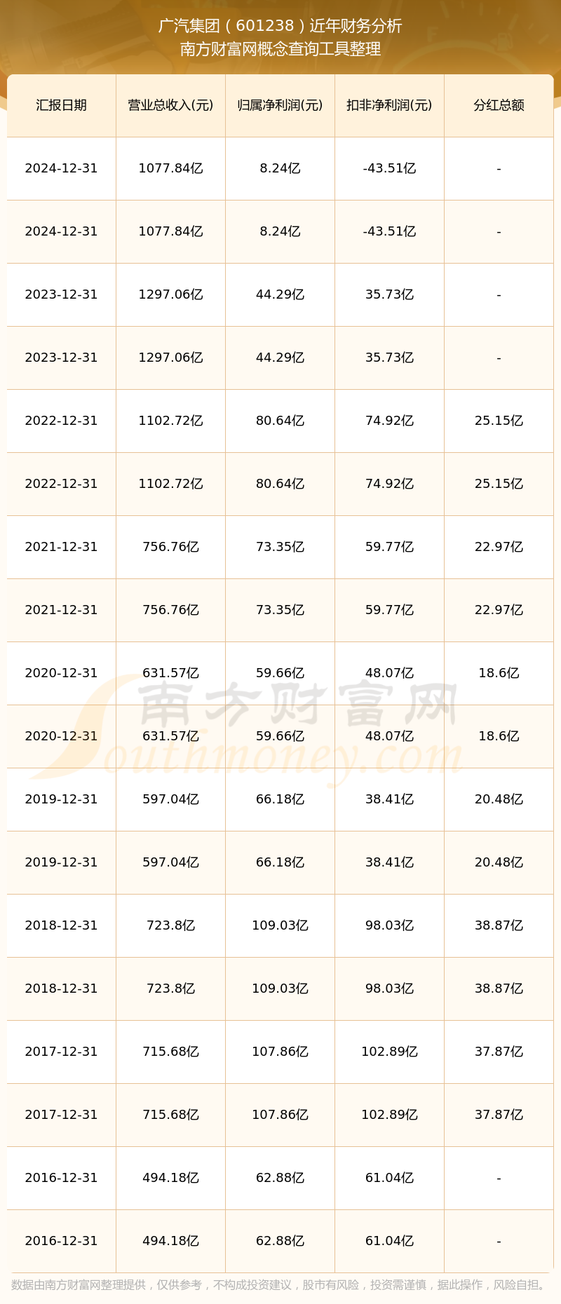廣汽集團歷年分紅派息情況如下表所示: