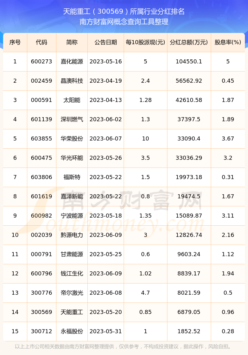按照南方財富網(wǎng)趨勢選股系統(tǒng)統(tǒng)計,天能重工所屬行業(yè)為風電設備行業(yè),風電設備行業(yè)分紅排名情況如下表: