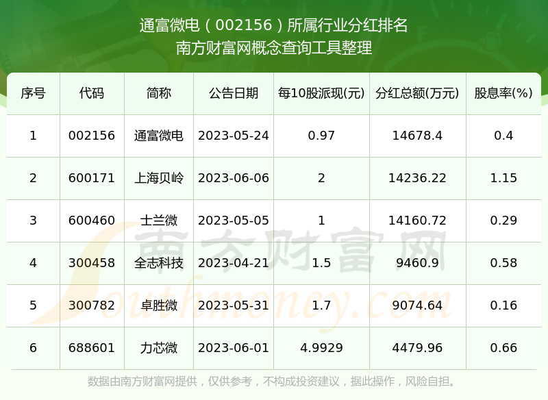 按照南方財富網(wǎng)趨勢選股系統(tǒng)統(tǒng)計,通富微電所屬行業(yè)為集成電路行業(yè),集成電路行業(yè)分紅排名情況如下表: