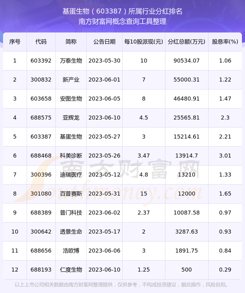 按照南方財(cái)富網(wǎng)趨勢選股系統(tǒng)統(tǒng)計(jì),基蛋生物所屬行業(yè)為試劑行業(yè),試劑行業(yè)分紅排名情況如下表: