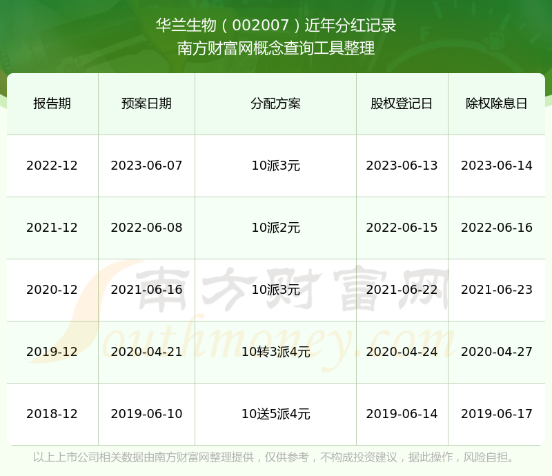 華蘭生物最新一次公布的分紅方案為10派3元。本次權(quán)益分派股權(quán)登記日為2023年6月13日,除權(quán)除息日為2023年6月14日,派息日為2023年6月14日。
