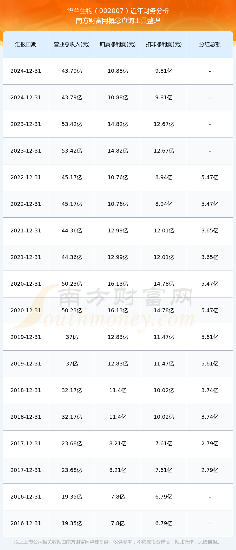 2024年報(bào)顯示,華蘭生物實(shí)現(xiàn)營收43.79億,同比增長-18.02%;凈利潤10.88億,同比增長-26.57%;毛利率61.45%。