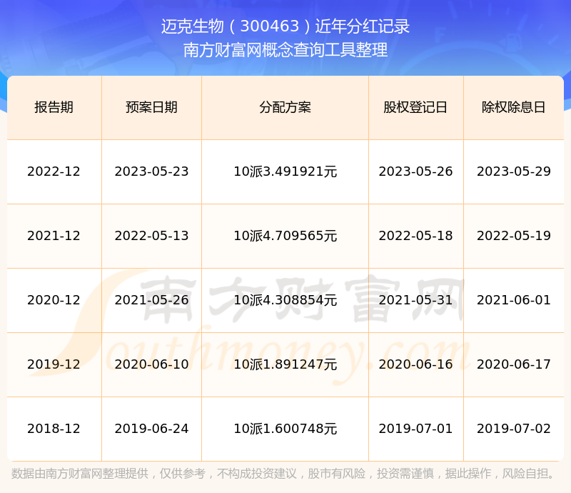 邁克生物最新一次公布的分紅方案為10派3.491921元。本次權(quán)益分派股權(quán)登記日為2023年5月26日,除權(quán)除息日為2023年5月29日,派息日為2023年5月29日。