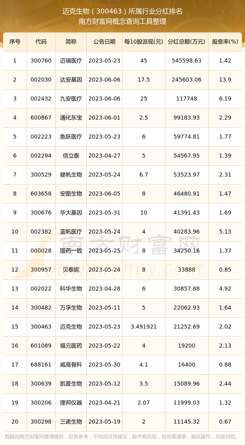 按照南方財(cái)富網(wǎng)趨勢(shì)選股系統(tǒng)統(tǒng)計(jì),邁克生物所屬行業(yè)為醫(yī)療器械行業(yè),醫(yī)療器械行業(yè)分紅排名情況如下表: