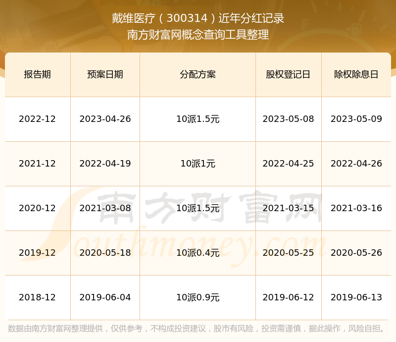 戴維醫(yī)療最新一次公布的分紅方案為10派1.5元。本次權益分派股權登記日為2023年5月8日,除權除息日為2023年5月9日,派息日為2023年5月9日。
