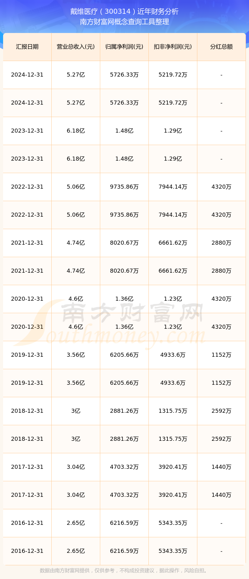戴維醫(yī)療歷年分紅派息情況如下表所示: