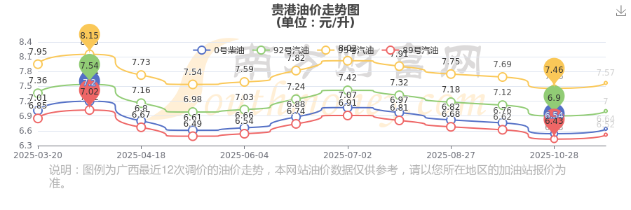 11月12日,貴港汽油、柴油每升的價格是多少?本次油價調(diào)整時間是11月11日,92號汽油為7元,上升了0.1元,上升幅達1.45%;95號汽油為7.57元,上升了0.11元,上升幅達1.48%;89號汽油為6.52元,上升了0.09元,上升幅達1.4%;0號柴油為6.64元,上升了0.1元,上升幅達1.53%。