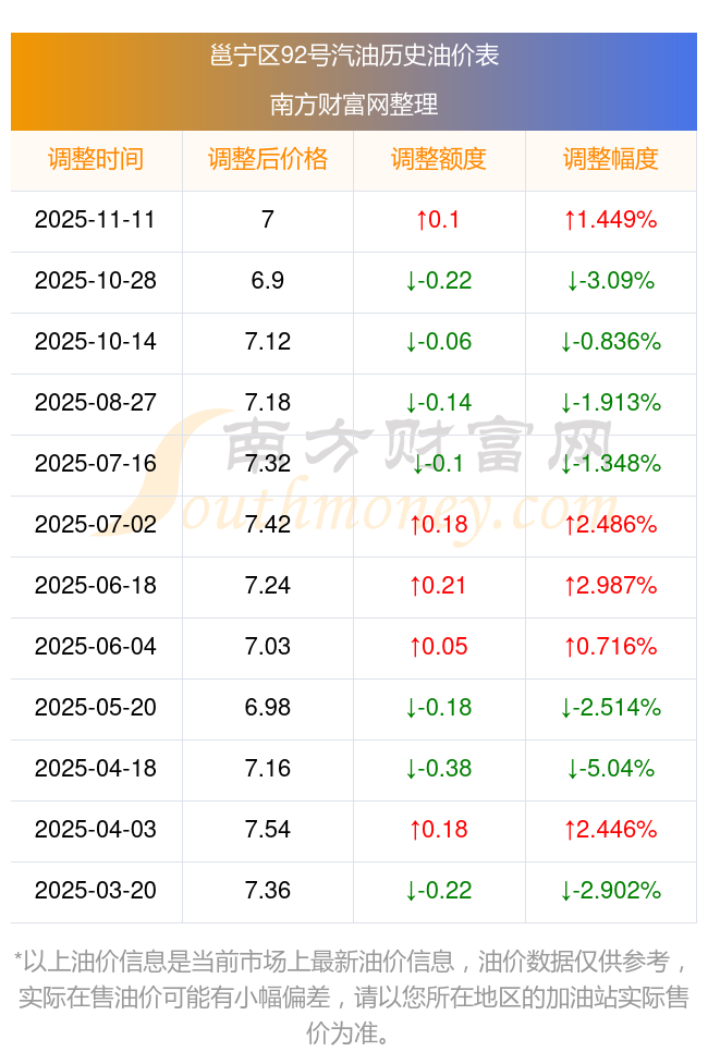 邕寧區(qū)11月12日92號(hào)汽油歷史油價(jià)調(diào)整一覽表